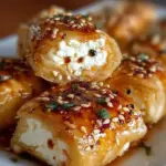 - Servieren: Nehme die frisch gebackenen Feta-Rollen aus dem Ofen und beträufle sie mit der vorbereiteten Chili-Honig-Sauce. Optional mit Sesamsamen bestreuen und warm servieren.